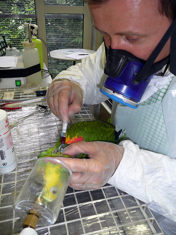 Nach der Implantierung des Identifikations-Transponders, der unspektakulär mit einer Sonde in die Brustmuskulatur gesetzt wird, erfolgt die Blutabnahme, bei dem verfetteten Tier eine heikle Aufgabe für den Spezialisten, da kaum Adern zu finden sind. In 2-3 Wochen werden wir die Laborbefunde von über 20 Blutparametern bekommen und die weitere Medikamentierung danach abstimmen. |