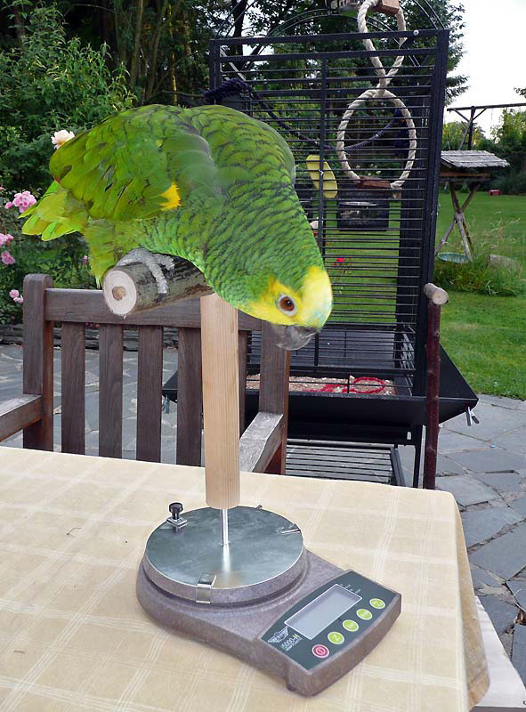 Am nächsten Tag: Turner hat die Prozedur gut überstanden und zeigt keine Verhaltens-änderungen. Das Einfangen mit dem Kescher ist wohl im Nebel der Narkose untergegangen. Jetzt kommt die neue Waage zum Einsatz und Turner kann es selbst kaum glauben: 766 Gramm sind eindeutig zu viel für eine normale Amazone. Ab jetzt werden harte Zeiten anbrechen, denn eine strikte Diät ist unausweichlich. Bis zum Jahresende muss Turner auf 600 Gramm runter, bis Ende 2009 sollte er bei seinem Normal-gewicht von 500 Gramm angekommen sein. Ab 600 Gramm wird Turner wieder fliegen können, meinte Dr. Janeczek, aber bis dahin ist es noch ein langer Weg und erst mal steht uns die heikle Futterumstellung bevor. |